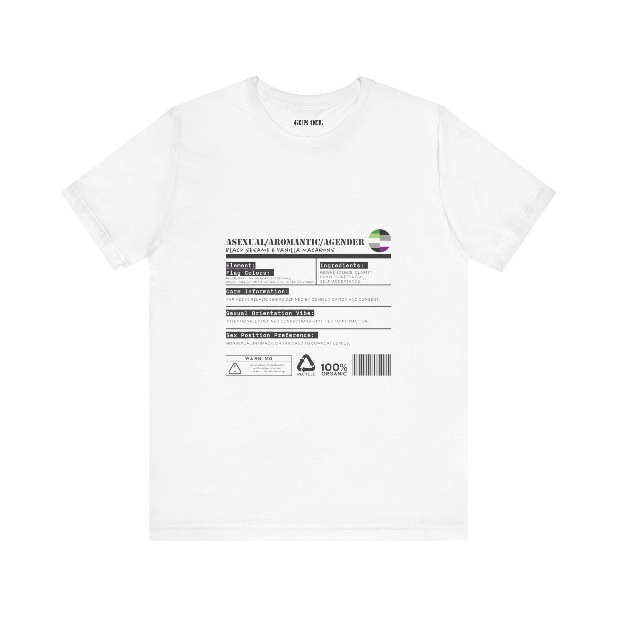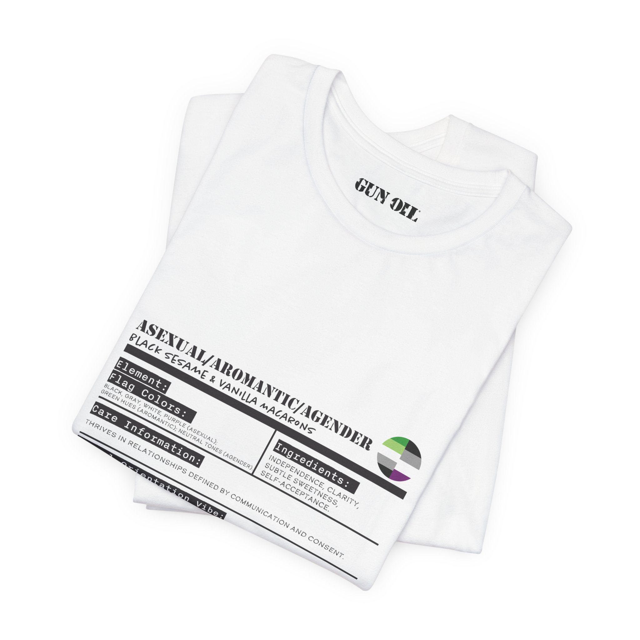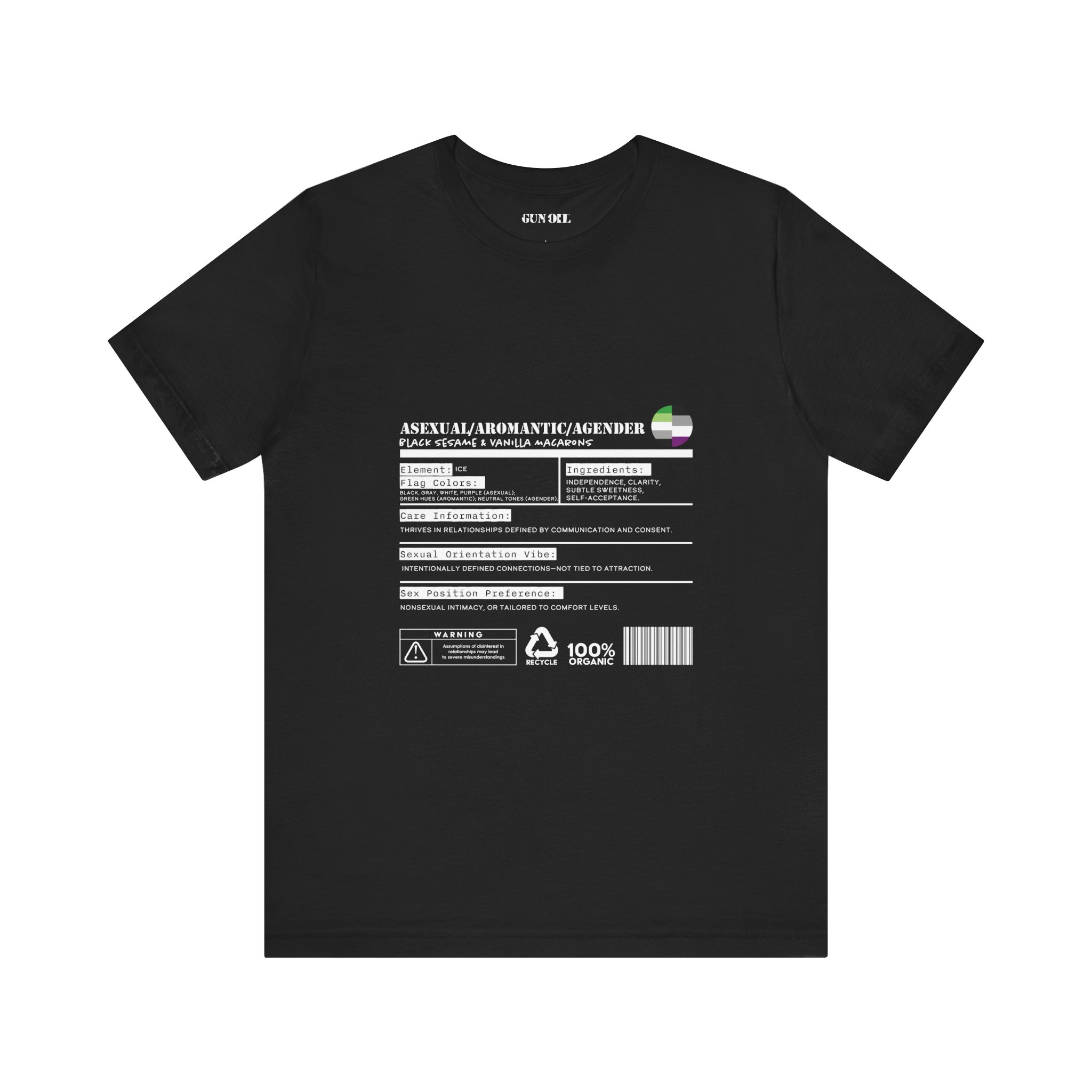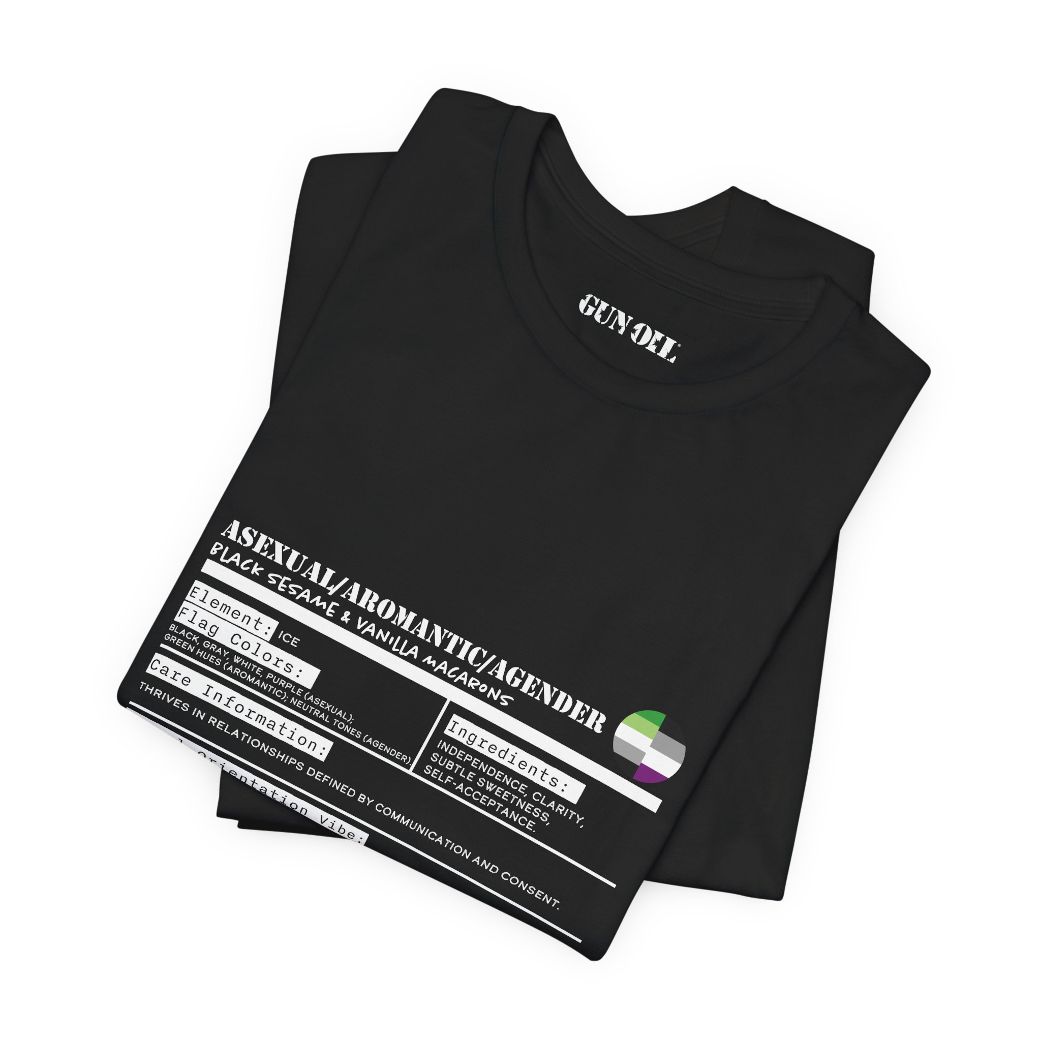 Authenticity? Check. Independence? Absolutely. Sweet but never saccharine? You got it. This tee is for those who thrive in relationships built on communication, not assumptions. Wrapped in the cool hues of the ace, aro, and agender flags, it’s a reminder that connection comes in many forms—and attraction isn’t a requirement.
