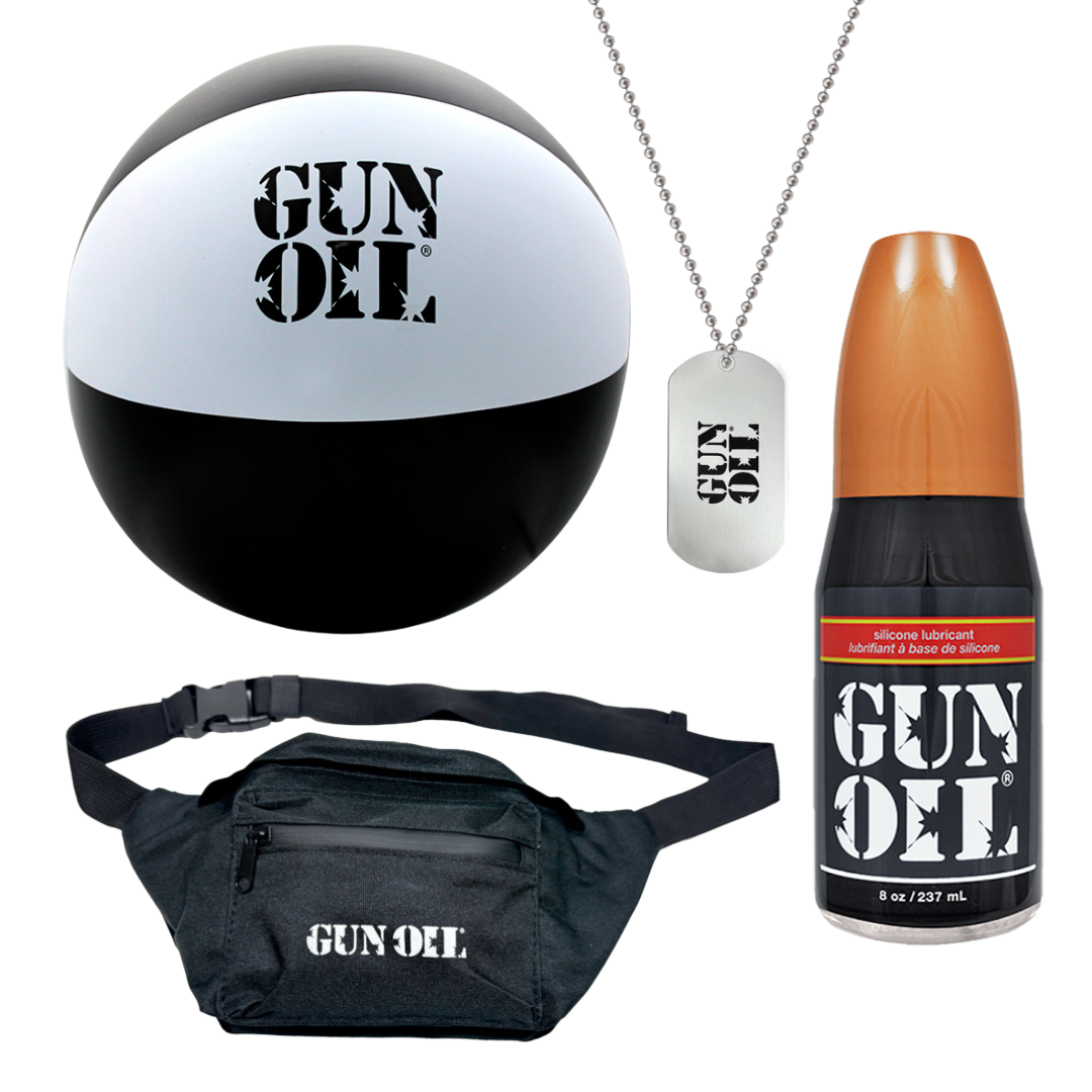 Our Summer Fun Bundle packs the essentials for your next pool party or beach day: an 8oz bottle of Gun Oil Silicone, a bold dog tag, our classic beach ball, and a water-resistant fanny pack to carry it all. Limited time only.